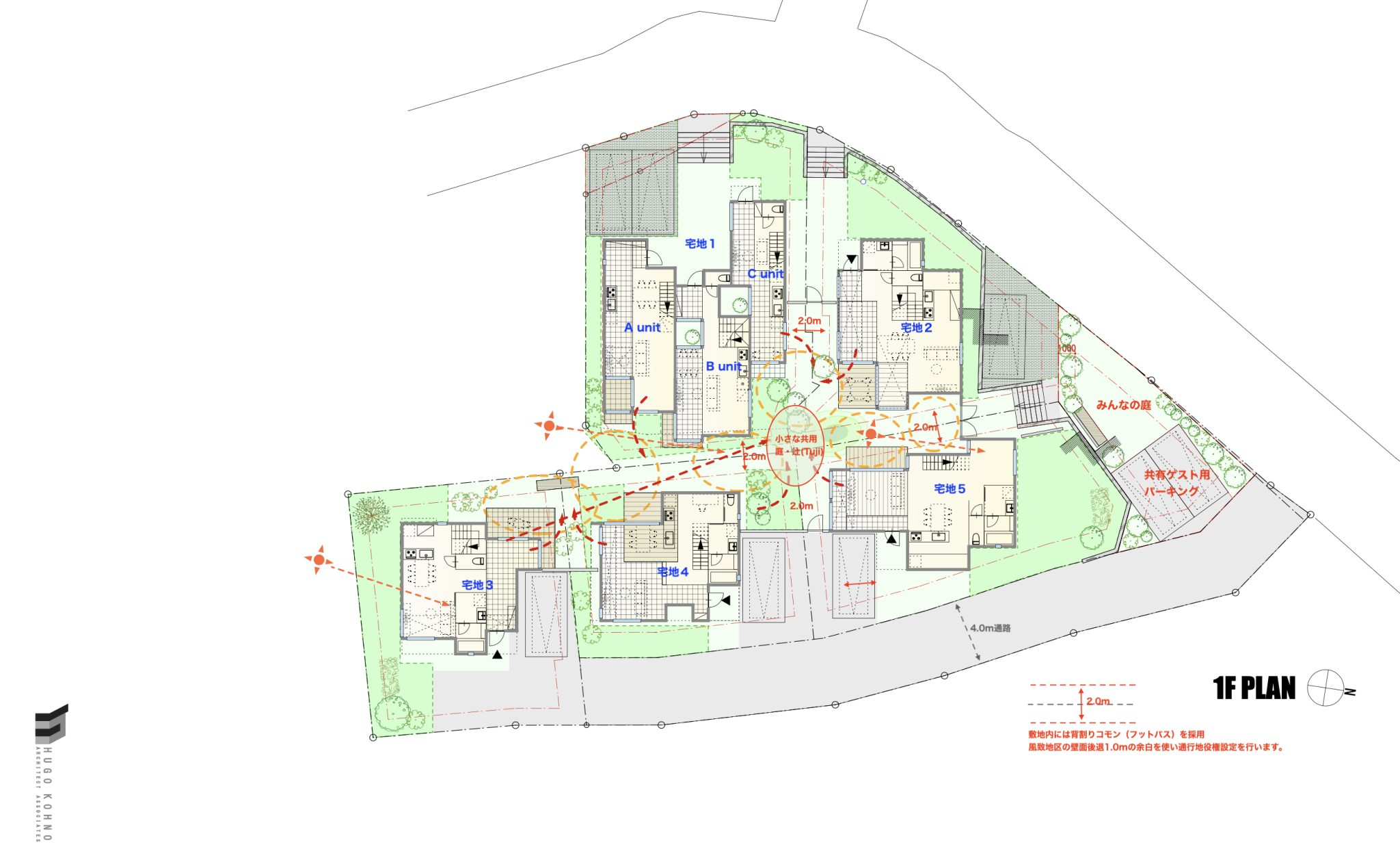 ランドデザインでは、風の通路としての機能、5棟の配置を工夫し、それぞれの建物の間に「背割りコモン(フットパス)」を通すことで、敷地全体に風が抜けるような設計を採用、コモンに面した側のデザインや植栽を統一することで、街全体としての一体感をつくります。